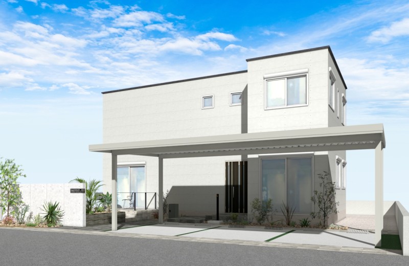 折板カーポートの顔となる鼻隠しの形状を見直すことで、高強度カーポートにありがちな無骨な印象から離れた、住宅デザインを調和しやすい意匠になりました。