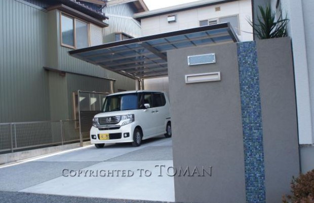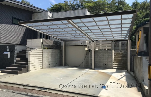 完全後ろ支持タイプの斬新なスタイルのカーポート。駐車スペースでの支柱の障害を感じさせないほどのスッキリ感が魅力です。