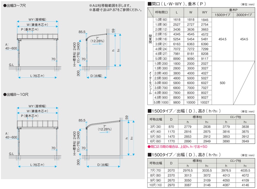 間口サイズは1.0間から3.0間までは単体で設置可能。