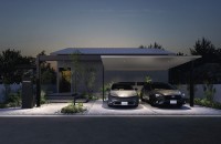 カーポートの屋根下に取り付け、夜間のエントランスを美しく演出する環境保全と省エネに配慮したLEDダウンライトです。