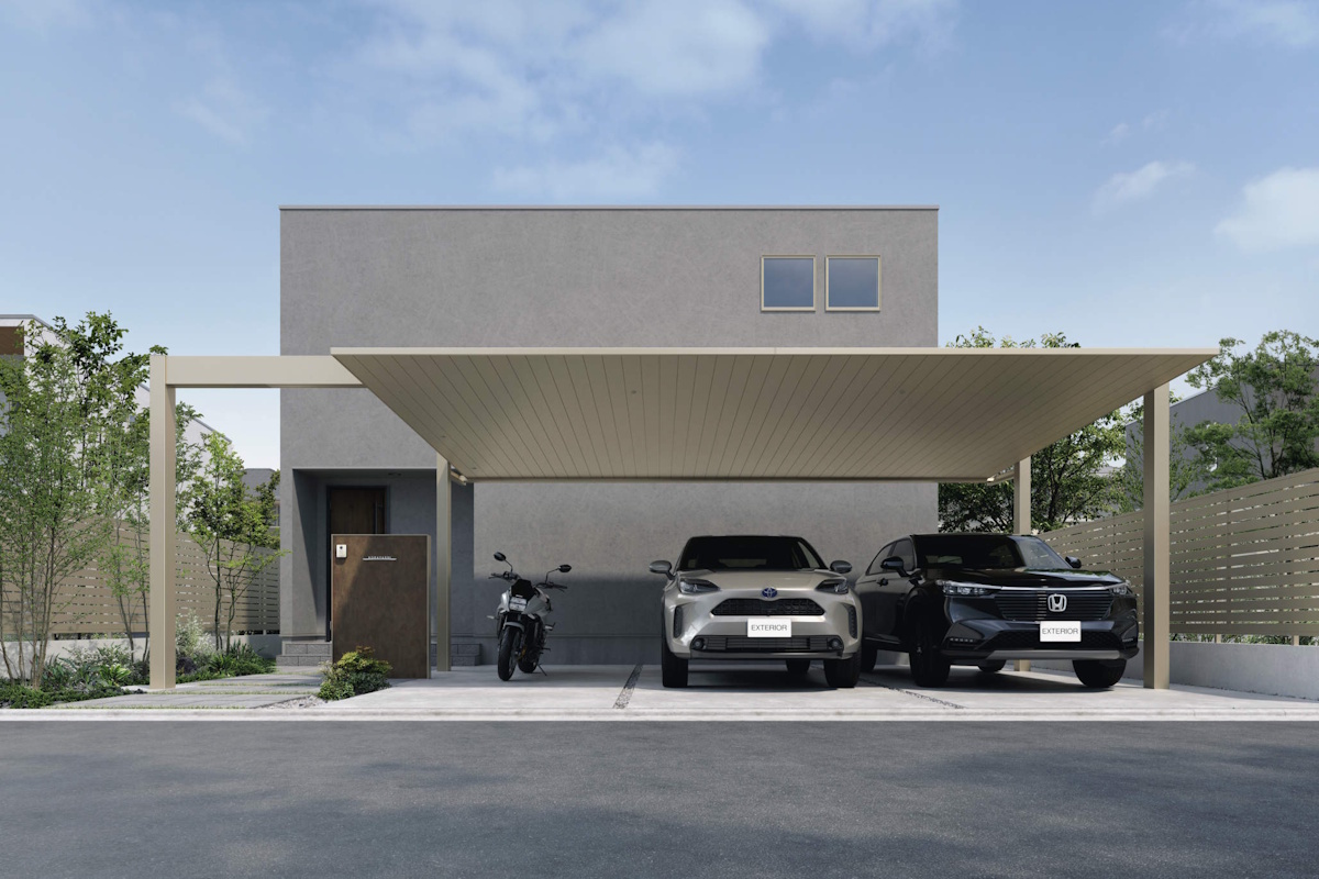 水平ラインにこだわった両側支持仕様は、建物・外構とのラインの揃った、一体感あるエクステリア空間を演出します。