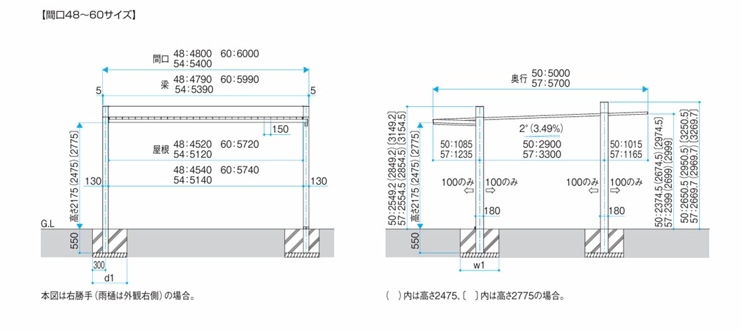 3台用サイズと同じ太さの柱にすることで強度を高めた積雪50㎝対応の2台用。