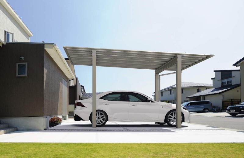 三協アルミのスカイリードは屋根に中残を持たない新構造が、カースペースに明るく軽快なイメージのカーポートです。