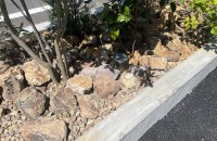 足元には無骨なぐり石を組み合わせ、 ロックガーデン × オージーガーデンを融合させた唯一無二の世界観に。 さらに、自動散水システムで日々のメンテナンスも最小限に。 “デザイン性・機能性・ブランド性”のすべてを高める外構空間が完成しました。