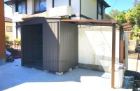 マツモト物置のスタンダードクラス物置「MNシリーズ」に、テラス屋根が付いた新しいライフスタイル空間を提案するデザイン物置です。