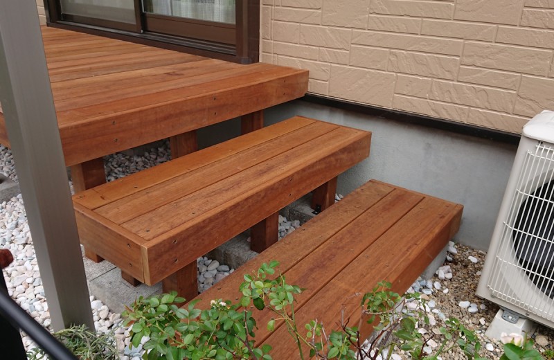 スペースを有効に利用した、掃き出し窓に取り付けたウリンデッキ。ステップをつけて、屋内外を便利につなぐことで、生活の動線も取りやすくなりました。