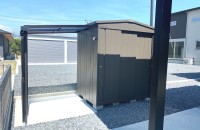 マツモト物置のスタンダードクラス物置「MNシリーズ」に、テラス屋根が付いた新しいライフスタイル空間を提案するデザイン物置です。