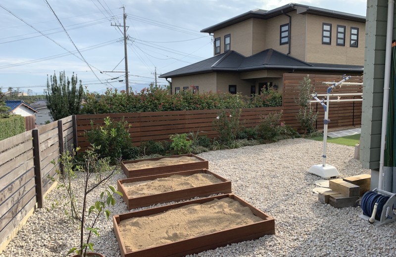 合わせて、ウリン材で造作した花壇・家庭菜園スペースもお庭に作りました。
