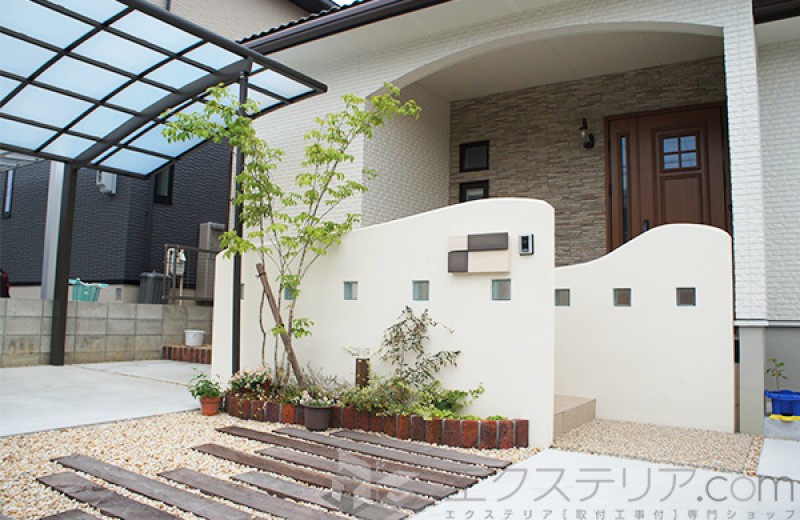 ご新築のエクステリア(外構)全般のご相談を頂き、設計デザインと施工を担当させていただきました。 アプローチの左右に分けた駐車場にそれぞれ1台用のカーポート・ネスカFを設置いたしました。 リクシル(LIXIL)のカーポート「ネスカF レギュラー」は、耐風圧強度 風速=38m/s相当で、屋根がフラット形状の、標準的なカーポートです。 三重県近郊(四日市市、桑名市、鈴鹿市、津市、名張市、伊賀市など)・東海地区(名古屋市周辺)・近畿地区でのカーポート工事なら、信頼と実績の当店にお任せください!!