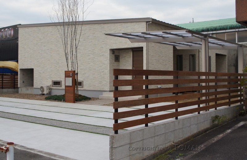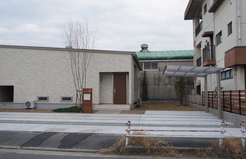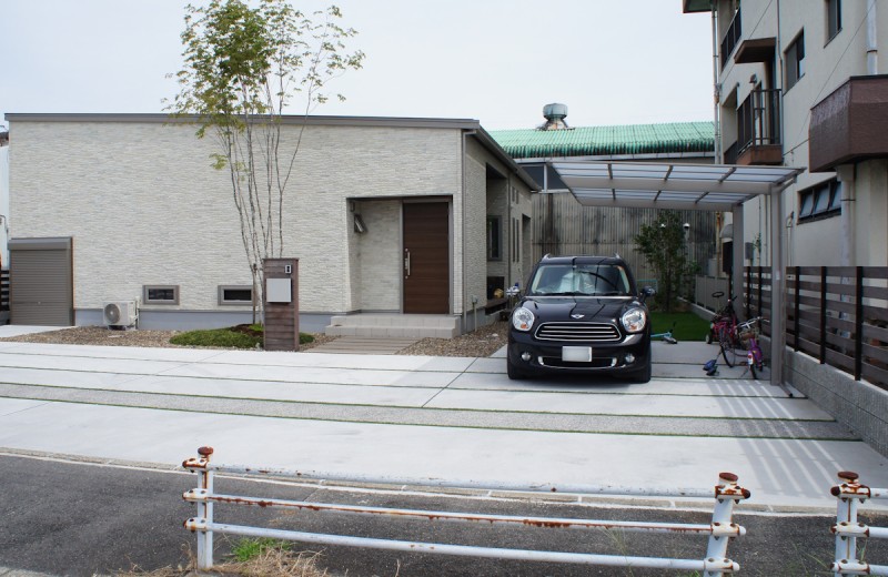 ご新築のエクステリア(外構)全般のご相談を頂き、平屋のモダンなご自宅にあわせたシンプルエクステリア(外構)をご提案。 駐車場にはカーポート・ネスカFを設置いたしました。 リクシル(LIXIL)のカーポート「ネスカF レギュラー」は、耐風圧強度 風速=38m/s相当で、屋根がフラット形状の、標準的なカーポートです。 三重県近郊(四日市市、桑名市、鈴鹿市、津市、名張市、伊賀市など)・東海地区(名古屋市周辺)・近畿地区でのカーポート工事なら、信頼と実績の当店にお任せください!!