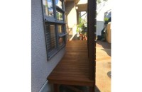 メンテナンスフリーの天然木ウリンを使用したウッドデッキ。敷地対応力の高い材料とスキルのある当店だからこそ可能な、高低差敷地・法面活用が可能なウッドデッキです。