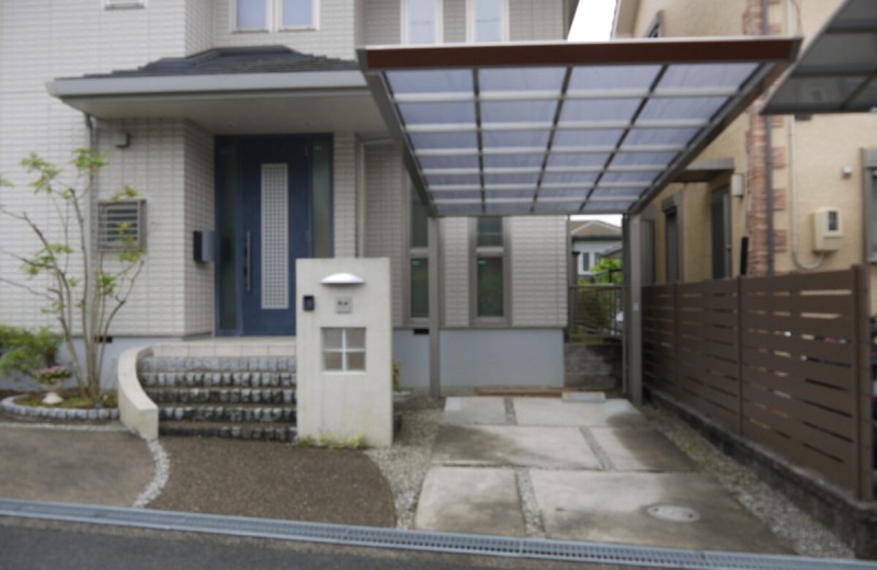 エクステリア.comプラス > 施工事例 > 三重県四日市市 O様邸 四国化成 マイポートNext 木調 1台用 後方支持カーポート 車庫 外構